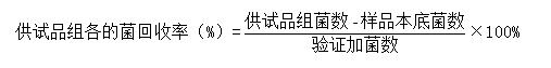 供试品组各的菌回收率(%)=[(供试品组菌数-样品本底菌数)/验证加菌数]×100%