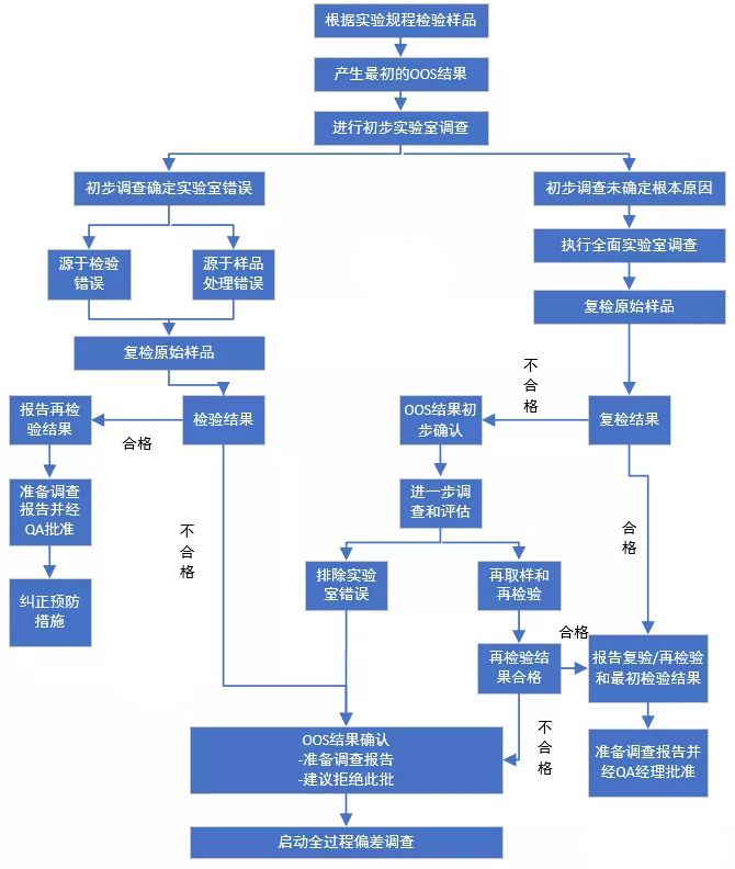 全阶段实验室调查包括对原始样品的再检验,进一步确认或否定最初的OOS实验结果并进一步评估是否考虑再取样或确定实验室错误。