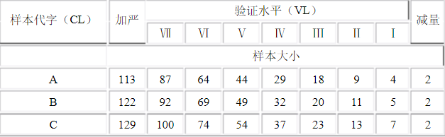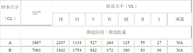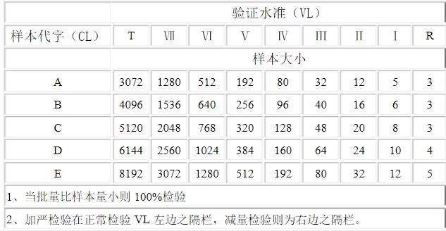 抽样水准分成正常检验、加严检验与减量检验等三阶段,除非另有其它规定,VL值以正常检验为启始,加严检验的VL在表2与表3的左边,减量检验则在右边,而表4的执行方式则较复杂,请参照表4附注说明。每一项品质特性的抽样水准不能改变。除非执行转换法则。