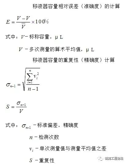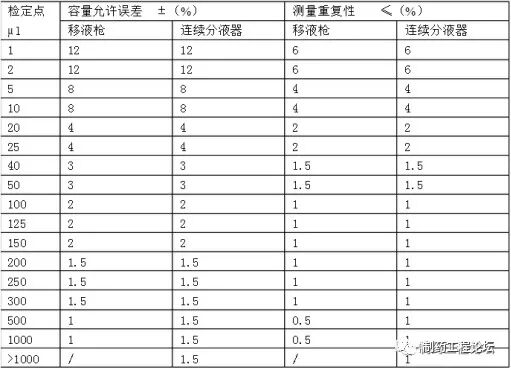 (2)外观、密合性合格,且所有使用量程的误差小于最大允许误差,标定“合格”。 表1 移液器最大允许误差 移液器在标准温度20℃时,其容量允许误差和测量重复性应满足下表要求: