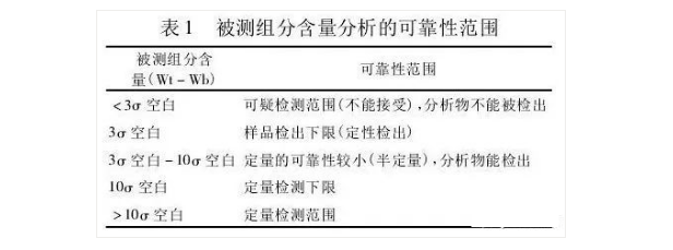 正因为如此,在实际使用中,样品检出限要比方法检出限要有意义得多。当被测样品种类变化或测定所用试剂和环境变化时,即使使用同一分析方法,样品检出限可能相差很大。在痕量分析时,测量结果的可靠性在很大程度上取决于空白值的大小及空白值的波动情况。设Wt代表被测样品的总值,Wb代表空白值,则被测组分的含量( Wt-Wb)与检测可靠性的关系如表1所示(表中“σ空白”为测定分析空白时的标准偏差)。