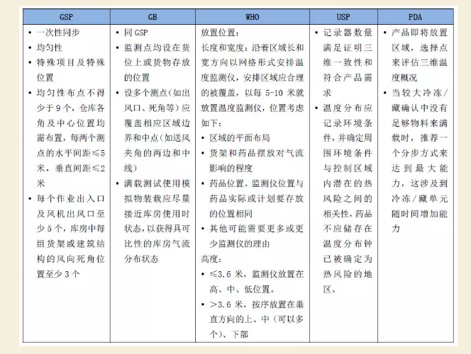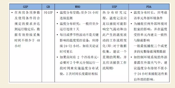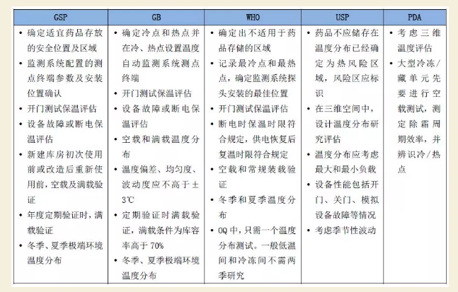 以上是针对中国、WHO、USP、PDA等不同标准的验证要求进行了对比,其中WHO的要求更为详细和科学,比如指南中有布点的具体要求和示意图;对不受操作影响的温度受控设施,可以将验证时间缩短至24-72小时。PDA在验证数据采集时间上更注重化霜周期。需要注意的是,在进行仓储区域的温度分布研究时,需要根据不同的标准结合实际情况开展。