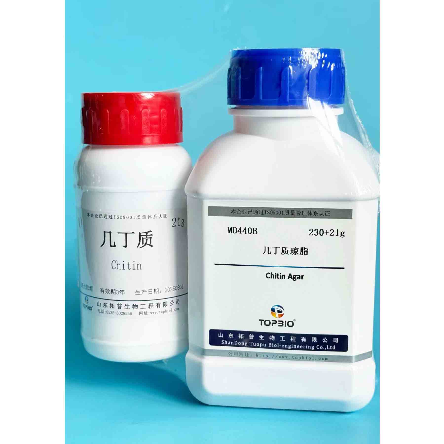 称取培养基21.71g和几丁质2.0g(几丁质需按照适宜方法制备成胶体几丁质)定溶于1L去离子水中,适当搅拌后,调节pH至中性(例如:7.3-7.5),加热搅拌煮沸1分钟以上使琼脂溶解,分装,121℃灭菌15分钟,灭菌结束后请摇匀,倾注平板,凝固,备用